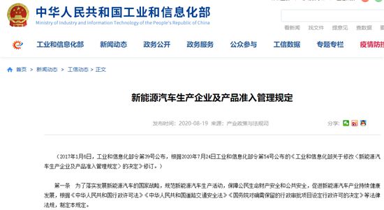 人民網(wǎng)北京8月20日電(王紫)19日,工信部正式發(fā)布了修改后的《新能源汽車生產(chǎn)企業(yè)及產(chǎn)品準(zhǔn)入管理規(guī)定》(以下簡稱“規(guī)定”)?!兑?guī)定》刪除了包括第五條以及《新能源汽車生產(chǎn)企業(yè)準(zhǔn)入審查要求》等附件中有關(guān)“設(shè)計(jì)開發(fā)能力”的相關(guān)內(nèi)容;將新能源汽車生產(chǎn)企業(yè)停止生產(chǎn)的時(shí)間由12個(gè)月調(diào)整為24個(gè)月;刪除了有關(guān)新能源汽車生產(chǎn)企業(yè)申請準(zhǔn)入的過渡期臨時(shí)條款?!兑?guī)定》將自2020年9月1日起施行。