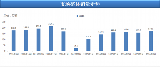 從整體市場銷量情況來看,8月乘用車市場零售銷量為170.3萬輛,同比增長8.9%,實現(xiàn)自2018年5月以來的最強正增長。根據(jù)統(tǒng)計,今年1-8月的零售累計增速-15.2%,較1-7月累計增速提升了3.3個百分點,體現(xiàn)行業(yè)的快速回暖態(tài)勢。