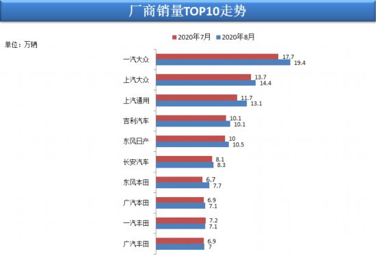 根據(jù)乘聯(lián)會數(shù)據(jù)顯示,狹義乘用車廠商8月銷量排行,前五位分別一汽大眾、上汽大眾、上汽通用,吉利汽車、東風日產(chǎn),銷量分別為19.4萬輛、14.4萬輛、13.1萬輛、10.7萬輛和10.5萬輛。排名與7月相同,各廠商銷量均有所增長。