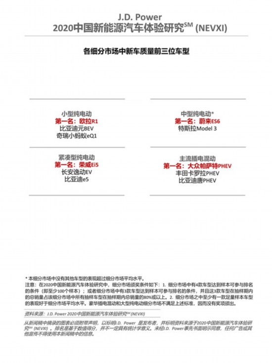 研究結(jié)果顯示,上汽大眾(105 個(gè) PP100)獲得插電混動(dòng)車(chē)市場(chǎng)新車(chē)質(zhì)量第一名,寶馬(108個(gè)PP100)位列插電混動(dòng)車(chē)市場(chǎng)第二位。蔚來(lái)(109 個(gè) PP100)獲得純電動(dòng)車(chē)市場(chǎng)新車(chē)質(zhì)量第一名,特斯拉(113個(gè)PP100)和歐拉(129個(gè)PP100)位列純電動(dòng)車(chē)市場(chǎng)第二和第三位;車(chē)型層面,歐拉R1榮獲小型純電動(dòng)細(xì)分市場(chǎng)第一;榮威Ei5榮獲緊湊型純電動(dòng)細(xì)分市場(chǎng)第一;蔚來(lái)ES6摘得中型純電動(dòng)細(xì)分市場(chǎng)第一;大眾帕薩特 PHEV 摘得主流插電混動(dòng)細(xì)分市場(chǎng)第一;豪華插電混動(dòng)和大型純電動(dòng)細(xì)分市場(chǎng)因?yàn)椴粷M(mǎn)足細(xì)分市場(chǎng)頒獎(jiǎng)條件,因而沒(méi)有獎(jiǎng)項(xiàng)頒出。
