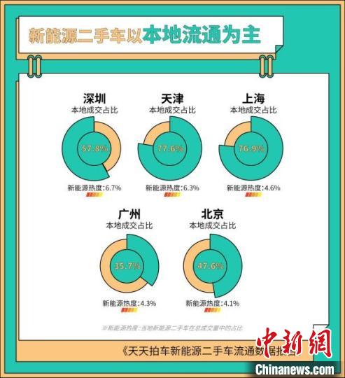 不過,在新能源二手車流通方面,本地化、區(qū)域化的交易目前仍是主要的流通方式。深圳的本地成交占比為57.8%、天津?yàn)?7.6%、上海為76.9%,從整體來看,本地成交的新能源二手車在天天拍車平臺的占比為63%,大部分的新能源二手車被本地買家買走。