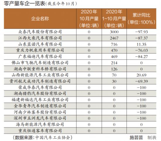 正如蔡榮華所言,我國(guó)汽車產(chǎn)銷量占全球30%左右,企業(yè)競(jìng)爭(zhēng)日趨激烈,但是盲目投資、產(chǎn)能利用率比較低的問題尚未得到有效解決?!吨袊?guó)汽車工業(yè)產(chǎn)銷快訊》(2020年第11期)數(shù)據(jù)顯示,在總共被統(tǒng)計(jì)的88家汽車企業(yè)中,今年10月汽車產(chǎn)量為零的汽車企業(yè)竟然多達(dá)17家(事實(shí)上,這一數(shù)據(jù)在8月為16家),今年前10個(gè)月產(chǎn)量低于500輛的共有25家,其中,有8家生產(chǎn)企業(yè)今年未生產(chǎn)過1輛汽車,占比接近一成。