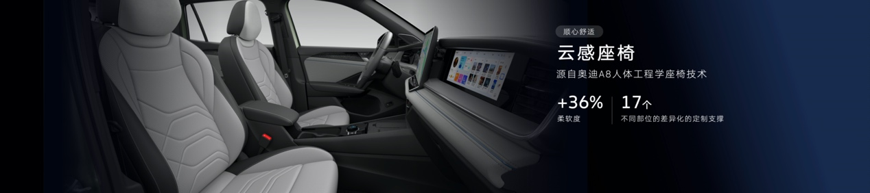 舒適體驗(yàn)上,全新探岳L配備了專為中國(guó)用戶研發(fā)的云感座椅,座椅柔軟度提升了36%,坐上去可以完全放松。除柔軟外,云感座椅還擁有Audi A8同款人體工學(xué)座椅設(shè)計(jì),提供身體從靠背到大腿共17處不同部位的差異化定制支撐,即使長(zhǎng)途駕駛也不感疲憊,讓更多用戶體驗(yàn)到越級(jí)的舒適。
