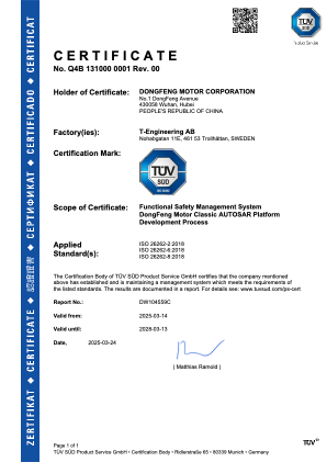 東風(fēng)汽車AUTOSAR基礎(chǔ)軟件平臺開發(fā)流程獲TüV南德意志集團認證證書