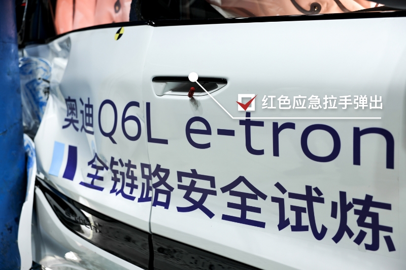 結(jié)果顯示,一汽奧迪Q6L e-tron車(chē)身結(jié)構(gòu)完整,A、B、C、D柱均未發(fā)生結(jié)構(gòu)性失效,兩次擠壓下乘員艙依然保持足夠的生存空間。安全帶正常預(yù)緊點(diǎn)爆,側(cè)氣囊、側(cè)氣簾及中央氣囊正常展開(kāi),全車(chē)假人傷害值均處于優(yōu)秀水平。電池組在遭遇“夾心式?jīng)_擊”后幾乎無(wú)變形、無(wú)位移,經(jīng)受住幾何形變與短路風(fēng)險(xiǎn)雙重考驗(yàn),未發(fā)生冒煙、起火、爆炸或電解液泄漏。高壓系統(tǒng)在毫秒級(jí)內(nèi)完成高壓斷電,有效避免短路造成熱失控風(fēng)險(xiǎn)。通過(guò)科學(xué)的走線,有效的結(jié)構(gòu)保護(hù),以及冗余的功能設(shè)計(jì),保障極限場(chǎng)景下低壓電正常工作。半隱藏式車(chē)門(mén)把手的紅色應(yīng)急拉手正常彈出,前排車(chē)門(mén)可正常打開(kāi),電動(dòng)座椅可調(diào)節(jié);車(chē)窗自動(dòng)下降,保障車(chē)內(nèi)空氣流動(dòng)。碰撞后雙閃及時(shí)開(kāi)啟,E-CALL及時(shí)啟動(dòng)并接通人工客服。從堅(jiān)若磐石的乘員艙結(jié)構(gòu),到周全可靠的碰撞后救援機(jī)制等,每一個(gè)安全細(xì)節(jié)都交出了高分答卷。