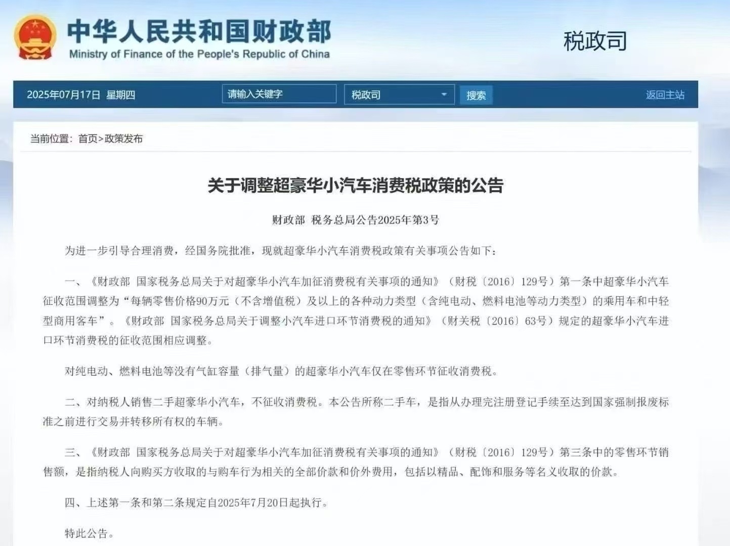 央廣網(wǎng)北京消息(記者董楠)7月17日,財(cái)政部、稅務(wù)總局聯(lián)合發(fā)布公告,對超豪華小汽車消費(fèi)稅政策作出調(diào)整。此次調(diào)整不僅將征稅門檻從130萬元(不含增值稅)降至90萬元,還在征稅環(huán)節(jié)、車型差異、二手車交易等方面做出明確規(guī)范,新政7月20日起正式執(zhí)行。這是2016年我國對超豪華小汽車加征消費(fèi)稅后的首次調(diào)整。