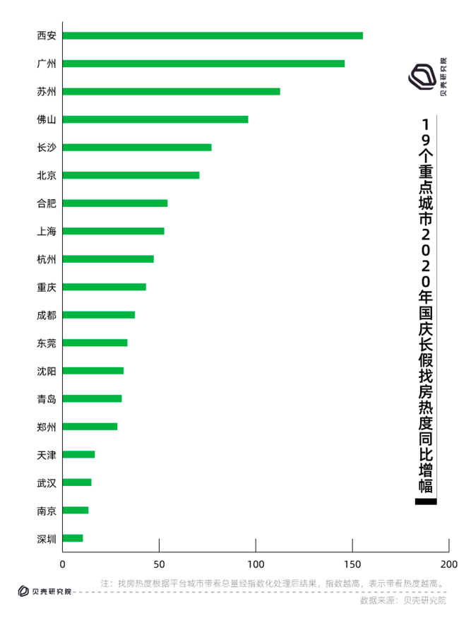而深圳受調(diào)控政策影響,總帶看量同比僅增長(zhǎng)10.5%,帶看增幅排在19個(gè)重點(diǎn)城市最后。同樣,在南京、武漢和天津,十一假期帶看量增幅排名靠后,同比漲幅未超過20%。