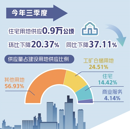 中國國土勘測規(guī)劃院新近發(fā)布的全國主要城市地價(jià)監(jiān)測報(bào)告顯示,三季度住宅用地供應(yīng)0.9萬公頃,環(huán)比下降20.37%,同比下降37.11%,住宅用地供應(yīng)同比增速為2015年以來單季最低。