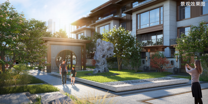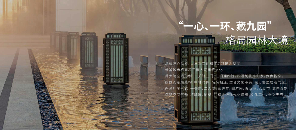 項目整體景觀設(shè)計以山林水源,禪意大宅為主線,將江南園林與皇家園林相結(jié)合,形成前府后院的園林形態(tài),景觀采用四級九景,四重栽植的造園手法,點綴了九個院落,四十個景點。園林鋪裝精致而具有設(shè)計感,在細節(jié)中加入特有的重視吉祥紋樣,更突出了新中式園林的設(shè)計風格。