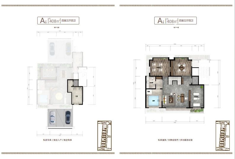地下室設(shè)計不同于傳統(tǒng)地下室,只能為儲藏室使用,而小區(qū)地下室層高和地上建筑面積層高一致,達到了3.2米,沒有空間壓抑感,在南北庭院都設(shè)有1.2米的通風采光井,室內(nèi)鋪設(shè)地暖及溫泉管道,上下水和衛(wèi)生間,私密性特強,可以設(shè)計桑拿房,健身房,保姆間,洗衣房,酒窖及休閑娛樂等多功能區(qū)域,對于鄰居既不會產(chǎn)生噪音干擾,更不會打擾到家人的休息,在提高了生活品質(zhì)的同時也不會由空間局促感,地下室可以直通地下私家車庫,車庫層高4.2米,寬約7-10米,至少可以容納家用汽車三輛。