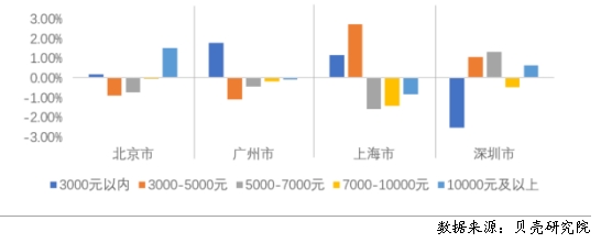 貝殼研究院數(shù)據(jù)顯示,一線城市呈現(xiàn)不同程度的重心下移,同時(shí)北京、深圳還呈現(xiàn)出延遲購房“購轉(zhuǎn)租”的特征,高套均支出區(qū)間的租賃房源成交增加。上海和廣州租賃重心下移態(tài)勢(shì)明顯。上海套均租金5000元以內(nèi)的成交占比增加了將近4個(gè)百分點(diǎn),5000元以上的占比均呈現(xiàn)減少趨勢(shì),尤其是套均租金在5000-10000元區(qū)間的房源占比;廣州套均租金在3000元以內(nèi)的增加了1.8個(gè)百分點(diǎn),3000元以上的均呈現(xiàn)減少趨勢(shì)。