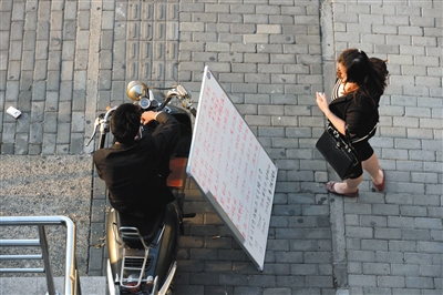 2013年10月14日,一位市民在看房產(chǎn)中介放置于上海自由貿(mào)易試驗區(qū)二號門附近的房源信息。圖/視覺中國