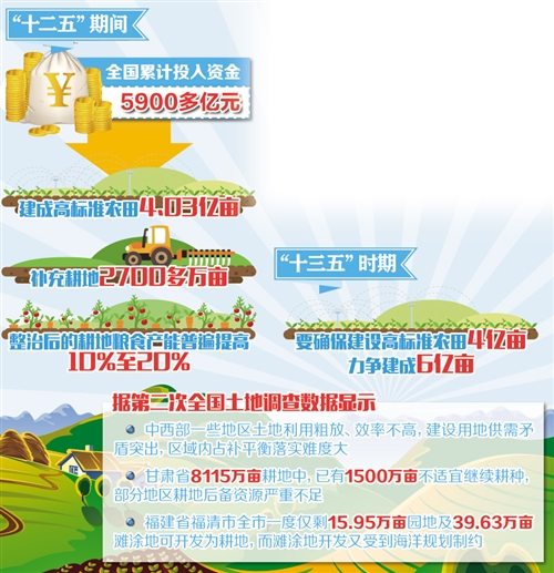 同時(shí),對耕地的建設(shè)性保護(hù)也迫在眉睫?!敖ㄔO(shè)性保護(hù)指通過工程措施改善耕地質(zhì)量?!敝醒朕r(nóng)辦副主任韓俊介紹,近年來,國家大力推進(jìn)土地整治與高標(biāo)準(zhǔn)農(nóng)田建設(shè),有效彌補(bǔ)了耕地產(chǎn)能損失。僅高標(biāo)準(zhǔn)農(nóng)田建設(shè)一項(xiàng),“十二五”期間,全國累計(jì)投入資金5900多億元,建成高標(biāo)準(zhǔn)農(nóng)田4.03億畝,補(bǔ)充耕地2700多萬畝,整治后的耕地糧食產(chǎn)能普遍提高10%至20%?!笆濉睍r(shí)期,要確保建設(shè)高標(biāo)準(zhǔn)農(nóng)田4億畝,力爭建成6億畝。