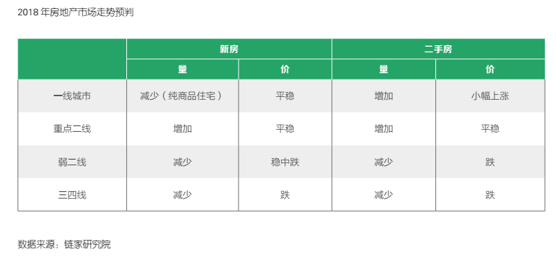 人民網(wǎng)北京12月27日電 (孔海麗)日前,鏈家研究院發(fā)布了《2018年房地產(chǎn)市場(chǎng)展望》研究報(bào)告。報(bào)告認(rèn)為,2017年是房地產(chǎn)市場(chǎng)超級(jí)繁榮期的尾巴,預(yù)計(jì)2018年成交量將會(huì)下降,新房投資增速進(jìn)一步下滑。就城市而言,預(yù)計(jì)一線城市二手房市場(chǎng)量?jī)r(jià)平穩(wěn),三、四線城市房地產(chǎn)市場(chǎng)將迎來(lái)量?jī)r(jià)的降溫。