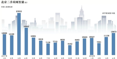 據我愛我家集團市場研究院統(tǒng)計,4月北京二手住宅共網簽13673套,同比2017年4月下滑19.1%,環(huán)比2018年3月上升22.6%。雖然同比仍在下降,但4月的二手房網簽量是去年5月至今12個月里的最高值。