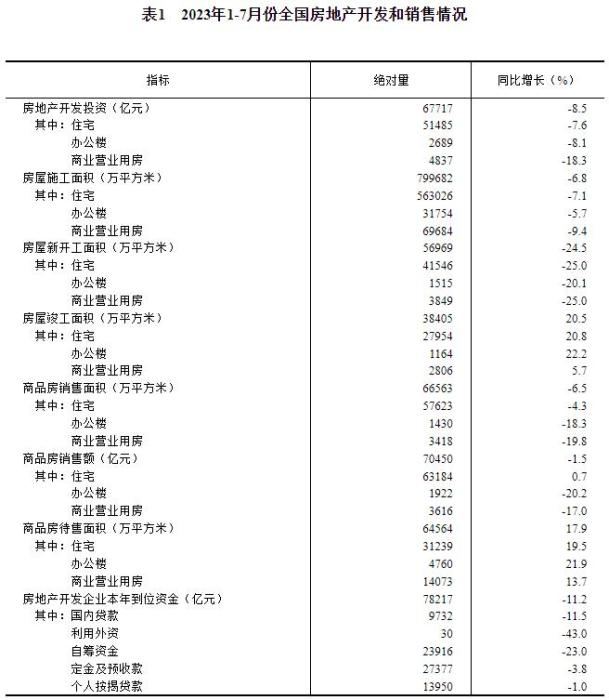中新網(wǎng)8月15日電 國家統(tǒng)計(jì)局網(wǎng)站15日公布2023年1—7月份全國房地產(chǎn)市場基本情況。1—7月份,全國房地產(chǎn)開發(fā)投資67717億元,同比下降8.5%;商品房銷售額70450億元,下降1.5%。