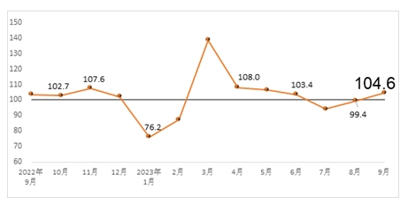 據中國建筑材料聯(lián)合會發(fā)布的數據顯示,2023年9月份建筑材料工業(yè)景氣指數為104.6點,較上月回升5.2點,高于臨界點,處于景氣區(qū)間,建筑材料工業(yè)運行有所恢復。