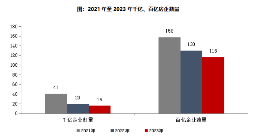 (圖源:中指研究院) 中指研究院企業(yè)研究總監(jiān)劉水分析稱,重點房企全年銷售呈現(xiàn)“前高后低”態(tài)勢。TOP100房企,2023年1-4月累計同比持續(xù)提升,5月之后增幅下降,下半年開始轉(zhuǎn)為同比下降并且降幅持續(xù)擴(kuò)大,全年整體上呈現(xiàn)“前高后低”的走勢。 克而瑞研究中心認(rèn)為,2023年,中國房地產(chǎn)市場修復(fù)不如預(yù)期,整體還處在調(diào)整之中。一季度經(jīng)歷低位拉升之后,二季度開始動能不足回落,下半年一直處于低位徘徊,行業(yè)百強(qiáng)累計業(yè)績繼續(xù)呈現(xiàn)負(fù)增長。 2023年百億以上陣營企業(yè)數(shù)量減少 中指研究院數(shù)據(jù)顯示,2023年銷售額超千億房企16家,較2022年同期減少4家,百億房企116家,較2022年同期減少14家。具體來看,千億以上陣營16家,較2022年同期減少4家,銷售額均值2214.2億元。第二陣營(500-1000億元)企業(yè)19家,較2022年同期減少4家,銷售額均值612.9億元。第三陣營(300-500億元)企業(yè)14家,較2022年同期減少14家,銷售額均值393.6億元。第四陣營(100-300億元)企業(yè)為67家,較2022年同期增加8家,銷售額均值200.2億元。