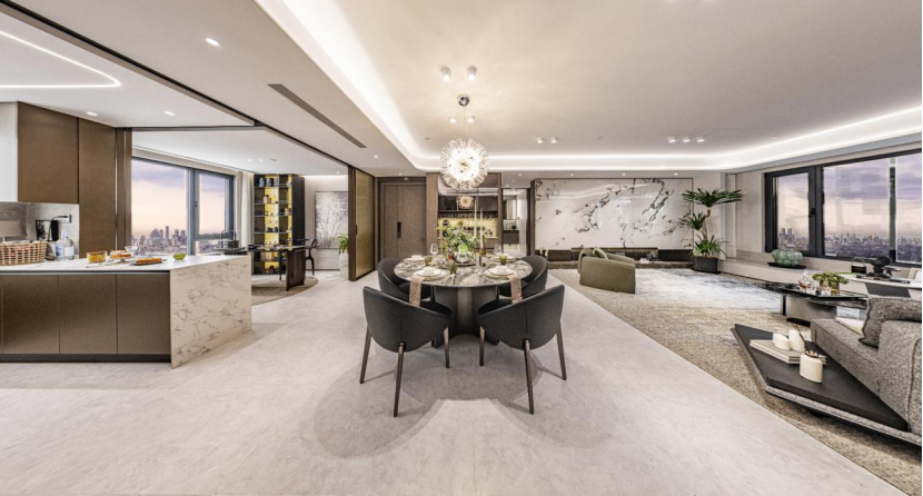 北熙區(qū)170平方米的四室兩廳兩衛(wèi)戶型則采用了現(xiàn)代簡約的設(shè)計風(fēng)格,摒棄繁復(fù)裝飾,使用精選皮革、藝術(shù)玻璃、古銅不銹鋼等現(xiàn)代材質(zhì)匹配大尺度橫向空間,塑造質(zhì)感美學(xué)空間。整體格局規(guī)整,南向面寬達(dá)13.85米,且設(shè)計了通透、多變的客廳空間,既能與廚房聯(lián)通,也可與書房互動,可以是朋友們的歡聚場,也可以是靜享品茗、閱讀美好時光的生活場。主臥套房酒店式設(shè)計,獨立衣帽間、獨立衛(wèi)浴,彰顯居者的居住尺度。