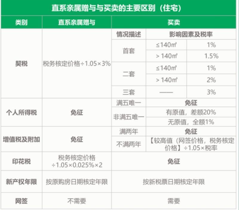 對此,北京鏈家簽約服務(wù)中心相關(guān)負責人表示,在直系親屬間進行房屋轉(zhuǎn)移(過戶)時,贈與和買賣是兩種常見的方式。雖然它們的目的相似,但在稅費方面卻存在顯著的區(qū)別。其中,贈與方式涉及契稅、印花稅,買賣方式則涉及契稅、個人所得稅、增值稅及附加、印花稅,具體可見下表。
