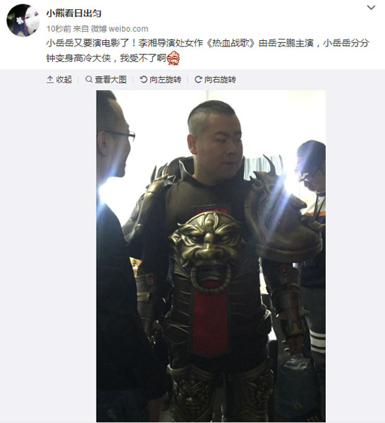 近日,網(wǎng)上流傳著一組岳云鵬身穿鎧甲手持寬重兵器的拍攝花絮照,照片中他一套夸張的武俠造型,霸氣外漏,一改以往“賤萌”的形象,引起網(wǎng)友們的圍觀。 據(jù)知情人士透露,照片中的岳云鵬正在為李湘的導演處女作《熱血戰(zhàn)歌》試裝。