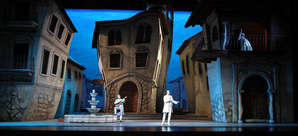 7月13日當(dāng)晚,隨著歌劇指揮莫蘭迪引領(lǐng)國家大劇院管弦樂團(tuán)奏出《塞維利亞理發(fā)師》膾炙人口的序曲旋律,大幕拉開,由著名舞臺(tái)設(shè)計(jì)師張武設(shè)計(jì)的“高迪建筑風(fēng)格”的塞維利亞小鎮(zhèn)展現(xiàn)在觀眾面前。