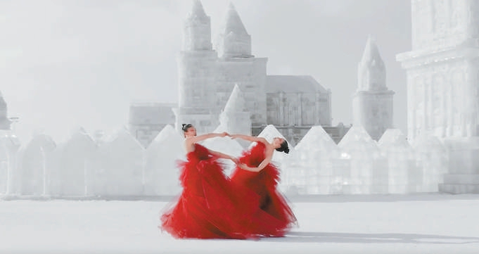 2021年,某時尚品牌的一則創(chuàng)意視頻《開放空間》火遍網(wǎng)絡(luò)。視頻中,幾位舞者在麥田、湖泊上奔跑、飛翔、翻滾,每一位舞者如同精靈,那種逐風(fēng)的自由讓無數(shù)觀眾眼前一亮,仿佛夢境成真。2022年,舞蹈影像導(dǎo)演李翠穎創(chuàng)作的《映雪紅珊》堪為黑龍江的絕美宣傳片。作品中,兩位身著夸張紅舞裙的舞者,在肅穆的冰雪世界中緩慢起舞,當呼吸凝成霧氣,冰封的大地如銀河一般靜寂,兩朵“紅梅”在凜冽與寂靜中開放,展現(xiàn)出中國極北之地的堅韌之美。