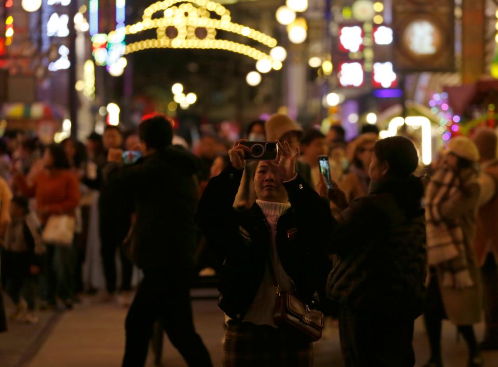11月16日晚,游人在建業(yè)電影小鎮(zhèn)內游覽拍照。新華社記者 戴翹楚 攝 位于河南省中牟縣的建業(yè)電影小鎮(zhèn)以電影主題演藝為核心,打造集電影互動游樂、電影文化體驗、電影主題客棧、民俗和非遺體驗等內容于一體的沉浸式文旅項目。夜晚時分,游人在小鎮(zhèn)中穿梭游覽,觀賞各類實景演出,體驗妙趣橫生的電影情境之旅。