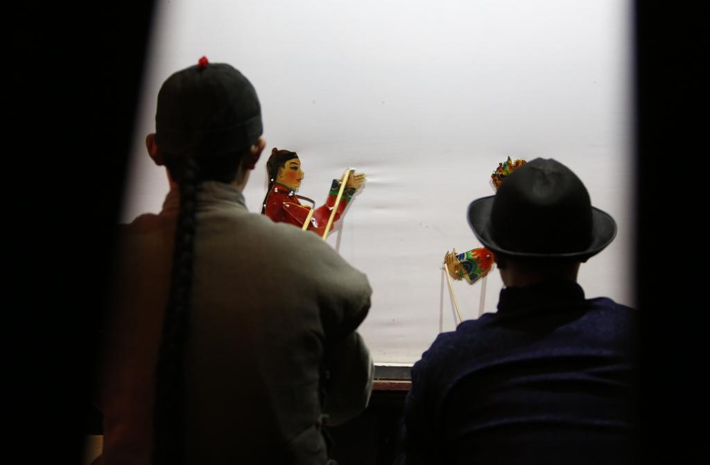 11月16日晚,工作人員在建業(yè)電影小鎮(zhèn)內為游人表演皮影戲。新華社記者 戴翹楚 攝