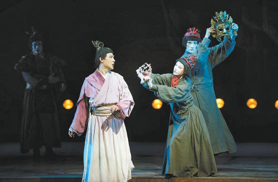 該劇舞臺效果頗具魔幻色彩和象征意義。懸掛于舞臺上方雄偉巍峨的神武宮房頂,像是一個巨大的鐵籠子,囚禁著劇中人物的內心。劇中音樂氣質融合了民族與現(xiàn)代,還加入了西涼樂、龜茲樂的元素,將觀眾帶領到或幽暗冰冷的宮闈,或刀光劍影的戰(zhàn)場。結尾時,襯于舞臺底幕的巨大面具支離破碎,巨幅紅綢從天而降,以強烈的視覺沖擊力帶給人們心靈和思想的震蕩。(記者 王潤)