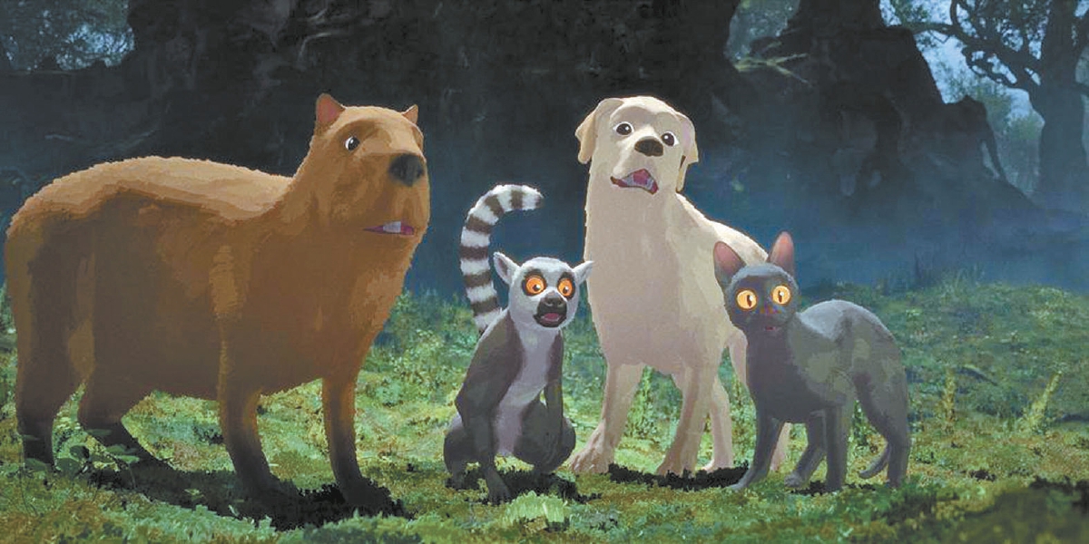 電影沒有半句對白。作為主角的小黑貓和同它一道漂流的動物們,都沒有便于人類認知的名字,也幾乎沒有被進行擬人化的設計。說“幾乎”是因為確有例外,卡皮巴拉因為叫聲太過尖銳刺耳,“不幸”地被聲音設計師以幼年鴕鳥的聲音取代。好吧,這也不是“擬人”,而是“擬鴕鳥”吧。