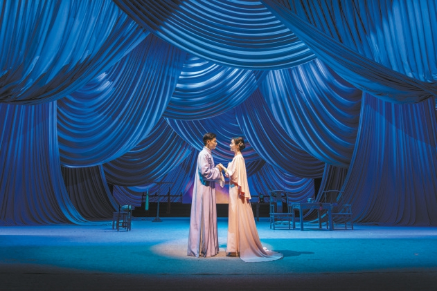 近日,北京人民藝術劇院再次排演該劇,以意象化手段賦予劇中男女主人公的愛情以詩意——不但在兩人交談時加入了許多戲曲身段,更加入了新的臺詞強化兩人的愛慕之情;結尾以一段雙人舞展現(xiàn)兩個自由的靈魂在虛空中的相會;不時出現(xiàn)的昆曲《牡丹亭》作為背景音樂,昭示兩人超越生死的愛戀。