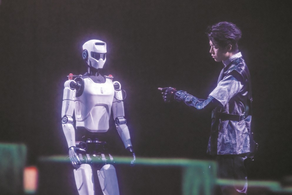 這是發(fā)生在中國(guó)大戲院長(zhǎng)三角城市戲劇節(jié)中的最“科幻”一幕,國(guó)內(nèi)領(lǐng)先的機(jī)器人走出實(shí)驗(yàn)室和展廳,以接地氣、親和的方式來到普通人身邊。面對(duì)這樣的場(chǎng)景,人們不再那么陌生——2025春晚上,張藝謀導(dǎo)演的《秧BOT》讓人形機(jī)器人略顯滑稽地扭起秧歌;上半年,半程馬拉松也迎來人形機(jī)器人“跌跌撞撞”的身影?!拔覀?cè)谔剿饕环N可能性,試著模擬發(fā)生在未來的場(chǎng)景。”《巨物之城》藝術(shù)總監(jiān)、上海戲劇學(xué)院藝術(shù)科技與管理學(xué)院副院長(zhǎng)沈倩對(duì)記者說,“無論對(duì)于機(jī)器人還是演藝產(chǎn)業(yè)來說,都具有破圈的意義。”誠(chéng)然,機(jī)器人仍在亦步亦趨地努力跟上人類的節(jié)奏,但其不斷前進(jìn)的腳步已經(jīng)令人激動(dòng)。面對(duì)“人機(jī)共生”的時(shí)代命題,上海邁出了全國(guó)舞臺(tái)實(shí)踐的第一步。