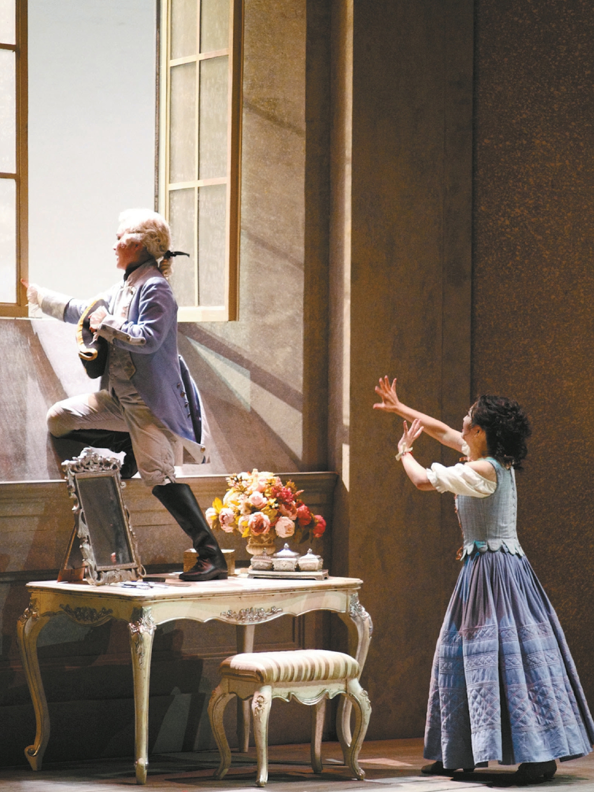 奧地利男中音馬庫(kù)斯·維爾巴飾演的費(fèi)加羅一登場(chǎng)便贏得滿堂喝彩。他以渾厚圓潤(rùn)的音色與精湛的表演技巧,將這位機(jī)智勇敢的男仆形象刻畫得入木三分。在詠嘆調(diào)“如果你想跳舞”中,維爾巴與國(guó)家大劇院合唱團(tuán)的默契配合將劇情推向首個(gè)高潮,合唱團(tuán)飽滿和諧的和聲為音樂(lè)增添了絢麗色彩。第一幕結(jié)尾處,維爾巴演唱的著名詠嘆調(diào)“再不要去做情郎”以明快有力的旋律與溫柔勸導(dǎo)的宣敘調(diào)交替呈現(xiàn),生動(dòng)展現(xiàn)了費(fèi)加羅幽默風(fēng)趣與堅(jiān)定勇敢的雙重性格,鏗鏘有力的演唱贏得全場(chǎng)掌聲雷動(dòng)。
