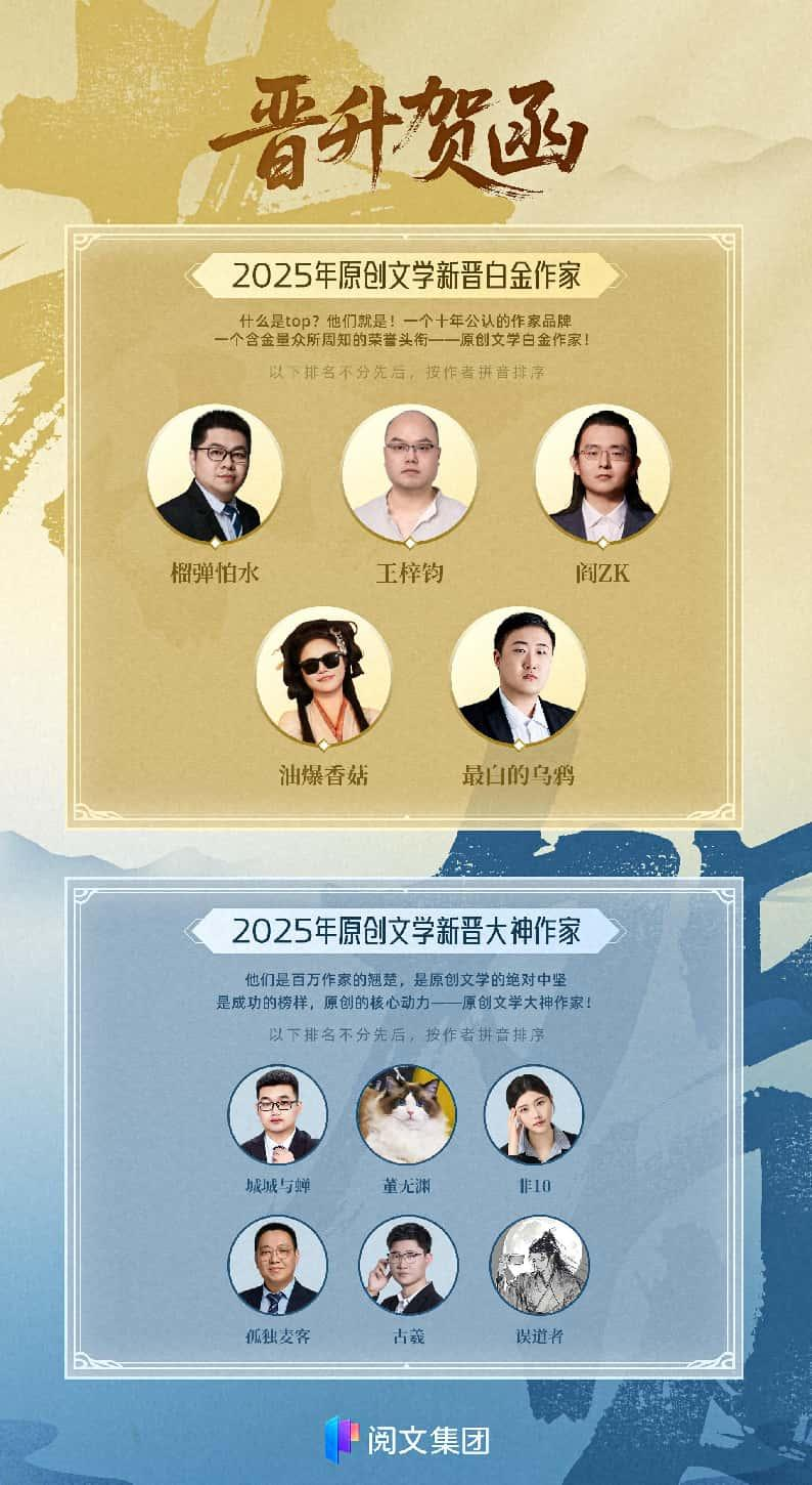 7月15日,閱文集團(tuán)發(fā)布2025年度“白金大神”作家名單,榴彈怕水、王梓鈞、閻ZK、油爆香菇、最白的烏鴉5名作者獲“白金作家”稱號(hào),城城與蟬、董無淵、非10、孤獨(dú)麥客、古羲、誤道者6名作者獲“大神作家”稱號(hào)。
