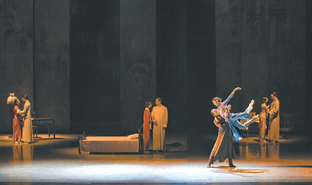 《永不消逝的電波》是韓真、周莉亞這對(duì)“舞壇雙子星”較早“出圈”的舞劇,在觀眾心中留下了很多經(jīng)典舞段。十余位身穿旗袍、手持蒲扇的女舞者,在《漁光曲》的旋律中曼妙起舞,浸透老上海風(fēng)情;與之產(chǎn)生強(qiáng)烈對(duì)比的是,披著黑色斗篷的特務(wù)在冷雨夜展開(kāi)驚心動(dòng)魄的追捕;李俠與蘭芬從假扮夫妻到發(fā)展為真正的愛(ài)人,幾對(duì)舞者的雙人舞同臺(tái)綻放。這些片段時(shí)常在舞蹈愛(ài)好者腦海中盤旋。