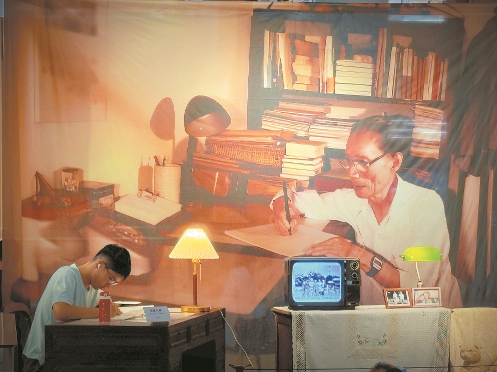 上圖東館手稿主題館展覽現(xiàn)場(chǎng),小讀者在主視覺區(qū)的仿真書桌與夏衍“對(duì)坐”。(主辦方供圖)