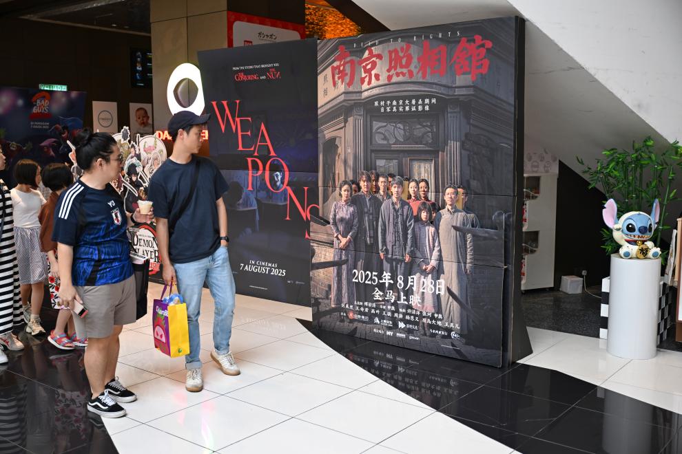 8月24日,在馬來西亞吉隆坡,民眾觀看《南京照相館》電影海報(bào)。新華社記者 程一恒 攝