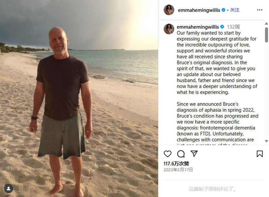2022年,布魯斯·威利斯的家人發(fā)布聯(lián)合聲明,宣布他將退出演藝事業(yè)。因?yàn)樗辉\斷患上失語(yǔ)癥,這影響了他的認(rèn)知能力和溝通能力。一年后,家人再次發(fā)文透露,他的病情進(jìn)一步發(fā)展,且有了更具體的診斷結(jié)果:額顳葉癡呆(FTD)。