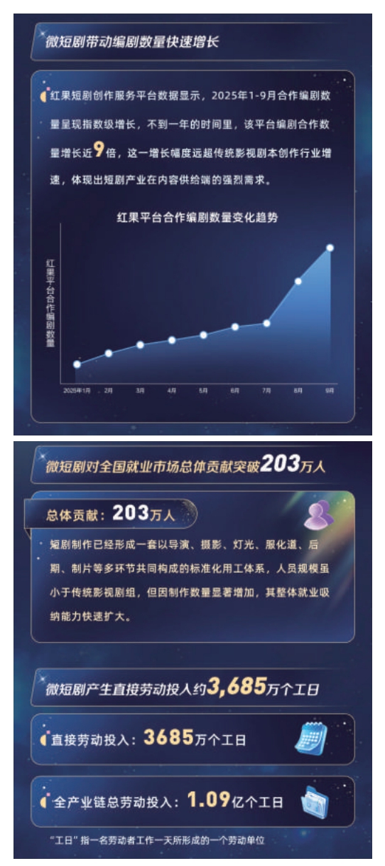 “微短劇通過(guò)龐大的規(guī)模效應(yīng)擴(kuò)大了整體就業(yè)容量,精準(zhǔn)激活了傳統(tǒng)影視行業(yè)中因項(xiàng)目斷檔而時(shí)?!e置’的人力資源,讓編劇、攝影師、場(chǎng)務(wù)、服化道等從業(yè)者實(shí)現(xiàn)了持續(xù)‘有活干、有錢(qián)賺’的良性循環(huán)?!睒I(yè)內(nèi)人士表示,“微短劇行業(yè)已成為吸納青年群體、靈活就業(yè)人員及傳統(tǒng)影視溢出人才的重要蓄水池,不僅為專(zhuān)業(yè)人才提供了舞臺(tái),也為大量勞動(dòng)者提供了實(shí)實(shí)在在的收入來(lái)源和職業(yè)發(fā)展路徑?!?/p>