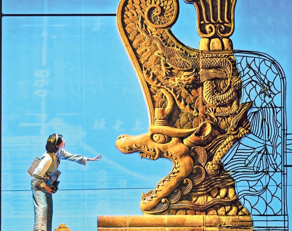 王琛透露,舞臺上關(guān)鍵的古建筑構(gòu)件均嚴(yán)格按照1∶1的真實(shí)比例復(fù)原制作,當(dāng)它們懸置于觀眾面前,一種視覺上的“沖擊力”油然而生,“觀眾能直觀體會(huì)到劇中人物每日工作的物理尺度和精神重量,體會(huì)測繪隊(duì)員是以怎樣的血肉之軀攀爬、丈量并挽留這份巍峨的文明。”舞臺地面,北平時(shí)期中軸線的建筑脈絡(luò)化為起伏線條,如紙張般弧形掀起,“寓意著古城文明在戰(zhàn)火中飄搖欲飛卻又根基深植的命運(yùn)。建筑的‘實(shí)’代表文明遺產(chǎn),圖紙的‘虛’代表傳承意志,虛實(shí)明暗的銜接過渡,共同凝固了那段驚心動(dòng)魄的歷史?!保ㄓ浾?高倩)