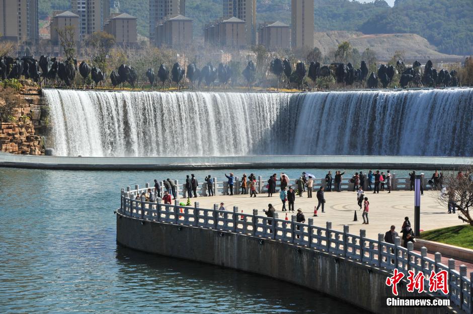 1月5日,游客在昆明瀑布公園內游覽拍照。據(jù)了解,昆明瀑布公園1月1日開始對民眾開放,公園的瀑布利用牛欄江引水入滇工程而形成人工瀑布及湖泊,其利用約12.5米的地勢高差,建設成寬幅約400米的人工瀑布,是中國最大人工瀑布。 中新社記者 任東 攝