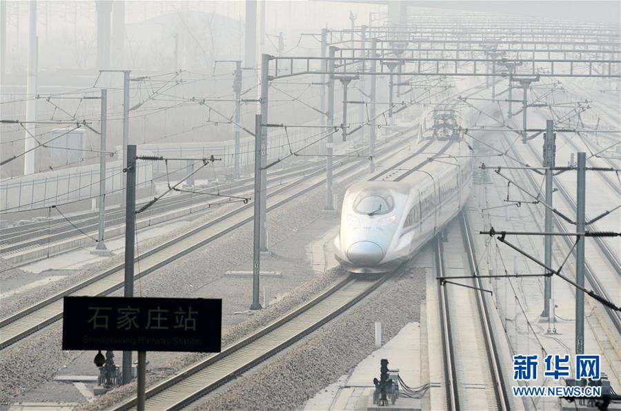一輛動車組列車駛離石家莊火車站(1月9日攝)。 1月10日零時起,全國鐵路實行新的列車運行圖,增開旅客列車285.5對,其中增開動車組列車281.5對。運行圖調(diào)整后,全國鐵路開行旅客列車總數(shù)達到3142對,其中動車組列車1980.5對。新華社記者 牟宇 攝