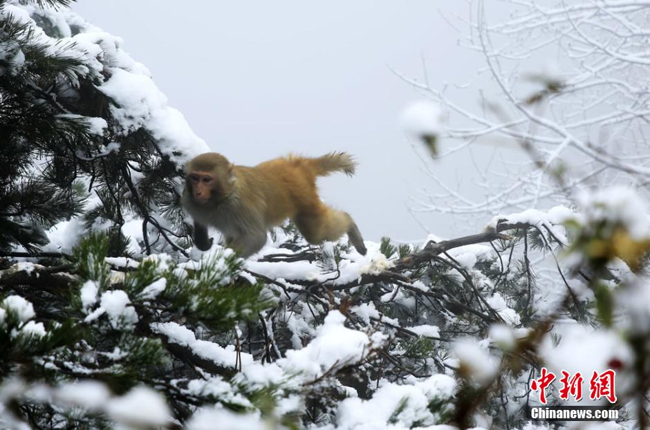 2月22日正值元宵佳節(jié),湖南張家界核心景區(qū)武陵源喜降春雪。在黃石寨景區(qū),成群的野生獼猴或在雪中追逐戲鬧,或在樹(shù)枝上攀爬跳躍,或蜷縮著身子賣萌,成為張家界武陵源的一道春季新景。吳勇兵 攝
