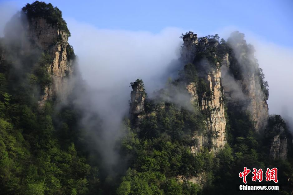 4月18日,雨過(guò)天晴的湖南張家界核心景區(qū)武陵源出現(xiàn)壯觀的“云瀑”景觀。雪白的濃云從峰林間向下翻騰,猶如天河傾瀉,氣勢(shì)磅礴。 吳勇兵 攝