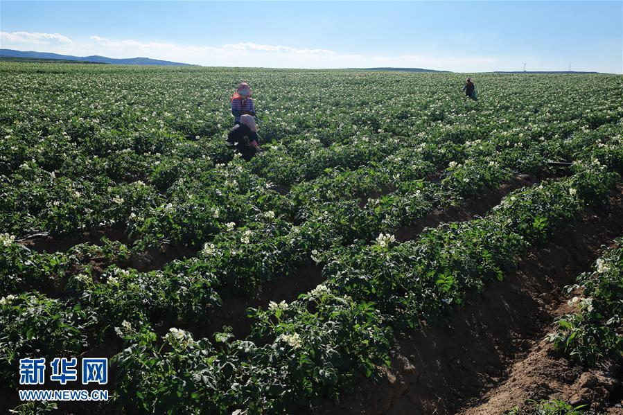 7月19日,在甘肅省定西市安定區(qū)香泉鎮(zhèn)馬鈴薯種植基地,農(nóng)民在進行馬鈴薯田間管理。