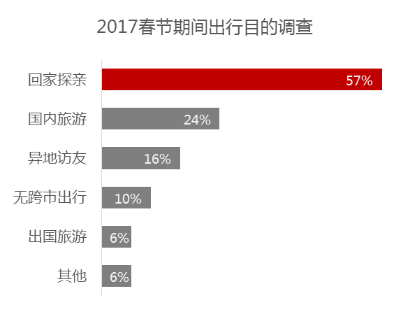 《報(bào)告》關(guān)于2017年春節(jié)跨市出行(長途出行)意愿的在線問卷調(diào)查數(shù)據(jù)顯示,“回家探親”是受訪者春節(jié)期間長途出行的第一大動(dòng)機(jī),“國內(nèi)旅游”則是第二大出行動(dòng)機(jī)??傮w而言,受訪者能夠明確給出的春節(jié)出行動(dòng)機(jī)中,除了“回家探親”,就是旅游(國內(nèi)游和出境游)。這表明,居民2017年春節(jié)期間的旅游消費(fèi)意愿強(qiáng)烈,旅游過年已經(jīng)成為較為主流的過年方式。