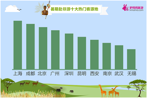 驢媽媽旅游網(wǎng)(以下簡稱,驢媽媽)數(shù)據(jù)顯示,今年暑期赴非游預(yù)訂人次同比上漲近2倍,赴非旅游熱情持續(xù)高漲,8月中上旬將迎來暑期出游最高峰。其中,追求獨特旅游體驗且有一定經(jīng)濟(jì)實力的25-40歲游客是赴非洲旅游的主力客群,該年齡段占比超7成;國內(nèi)城市中,上海、成都、北京、廣州、深圳、昆明、西安、南京、武漢、無錫成為十大熱門客源地。
