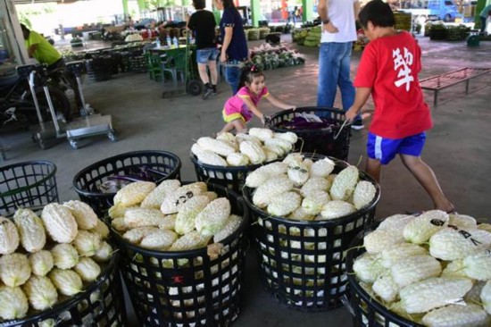 臺(tái)東在地苦瓜、絲瓜滯銷,價(jià)格下跌,在果菜市場幫忙的小朋友,請大家多采購好吃又便宜的苦瓜。(圖片來源:臺(tái)灣《中時(shí)電子報(bào)》)