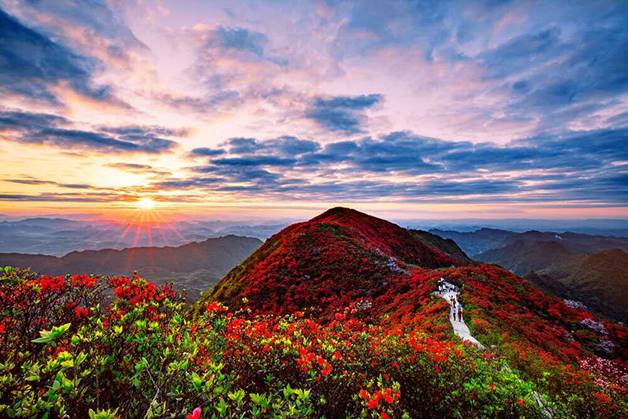 同樣選擇在薄霧初上的黎明出發(fā),順著龍泉山蜿蜒的石板路拾階而上,途徑一座古樸典雅的半山?jīng)鐾さ诌_(dá)山頂,眼前的奇觀如畫卷般徐徐展開:這是一片壯闊的云海,幾處鮮艷的杜鵑花叢在云霞中若隱若現(xiàn),云海下隱藏著一整片杜鵑花海,延綿好幾公里,將龍泉山脈裝點(diǎn)得一派火紅,日出時東方天際噴涌而出的紅霞映照著云海杜鵑,仿佛給空氣鑲上了紅色濾鏡,一時間群山都變得奇幻瑰麗,這是丹寨龍泉山別具一格的云上杜鵑花海——云海不稀奇,花海也常有,云上花海卻是大多數(shù)人這輩子難得一見的奇觀,想親眼目睹嗎?
